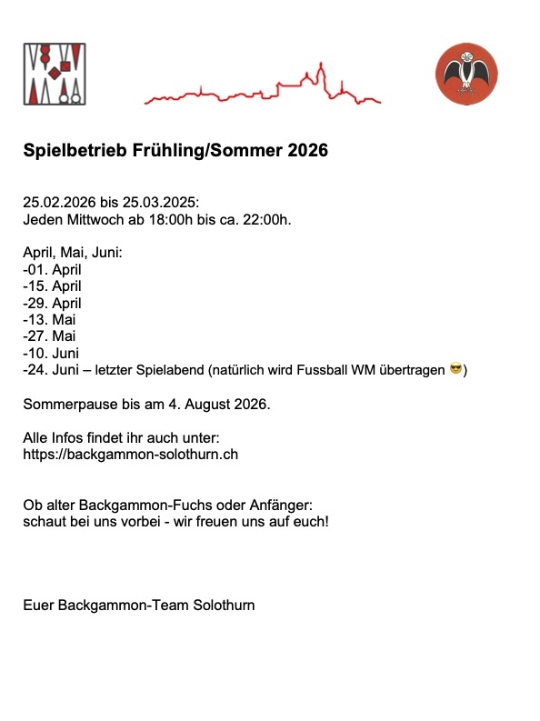 Bis Ende März 2026 spielen wir wöchentlich, ab April nur noch jeden 2. Mittwoch Abend. Hier ist unser aktueller Spielplan alle Termine entnimmst du auch unserem Kalender: https://backgammon-solothurn.ch/events/